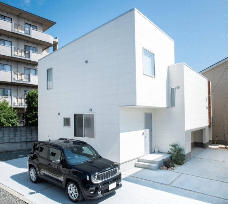 青空に映える白のキューブ。光差し込むテラスのある開放的な家。