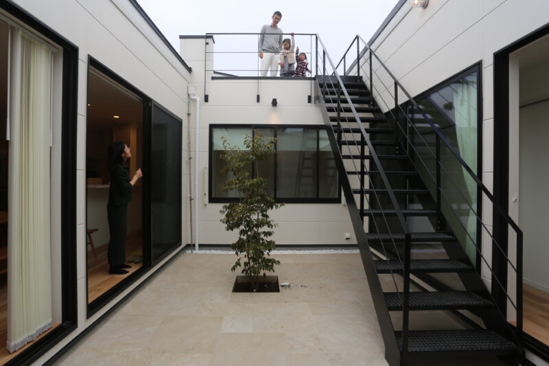 屋上テラスと中庭がある、カーテンレスで開放感ある平屋。